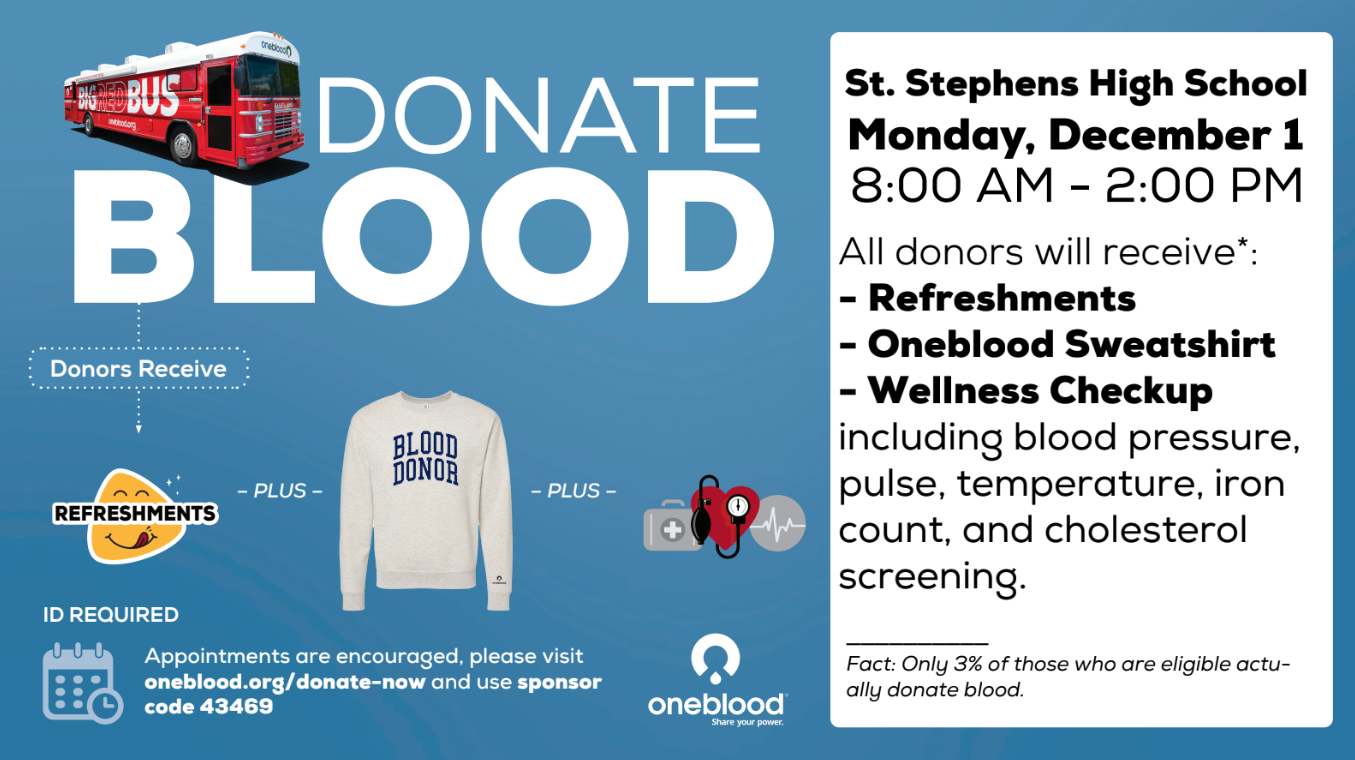 Join us at St. Stephens High School on December 1 from 8:00 AM–2:00 PM for a OneBlood community donation event!