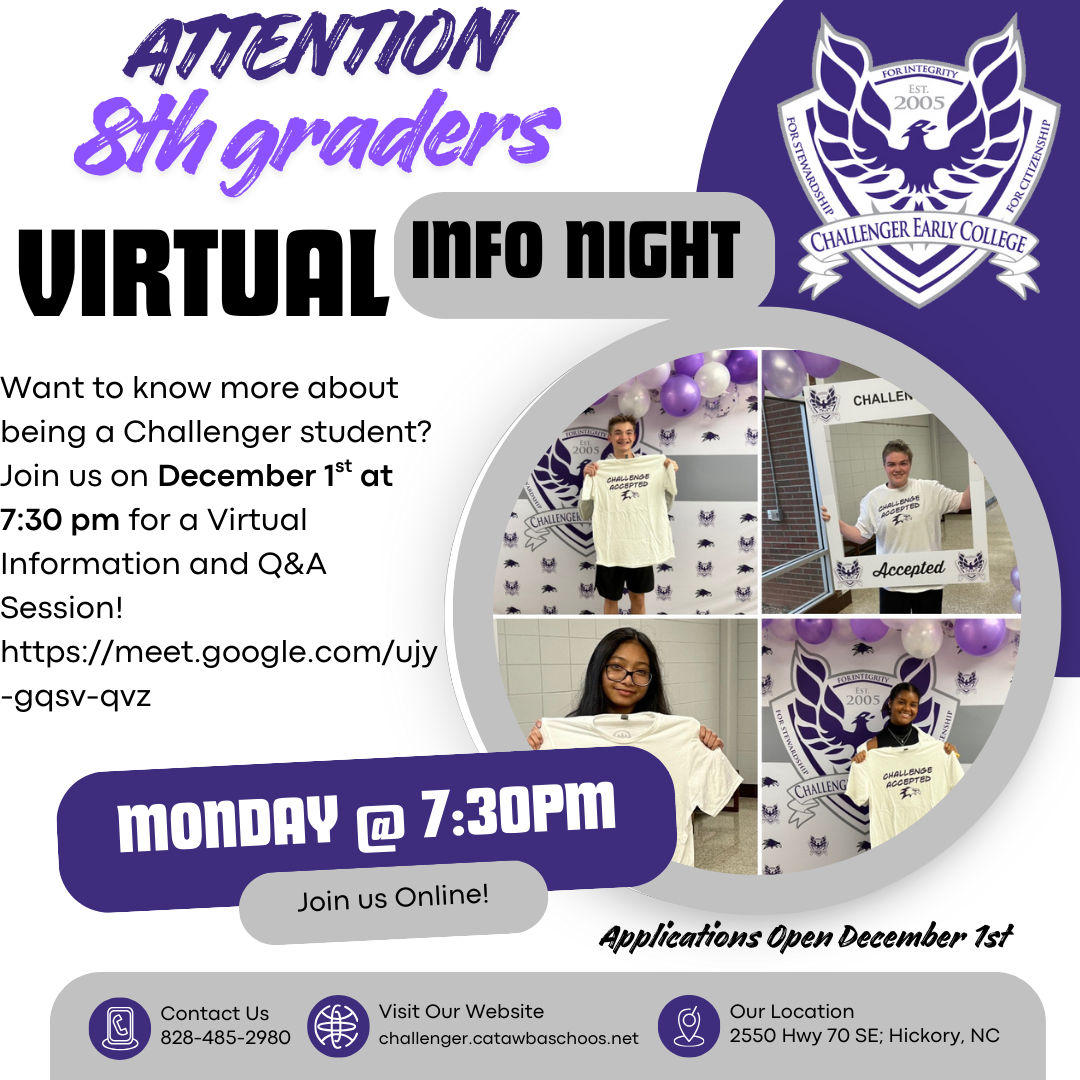 Are you an 8th grader—or a parent of one—interested in applying to Challenger Early College High School? Join us for a Virtual Info Night & Q&A to learn more about academics, campus life, and the application process.