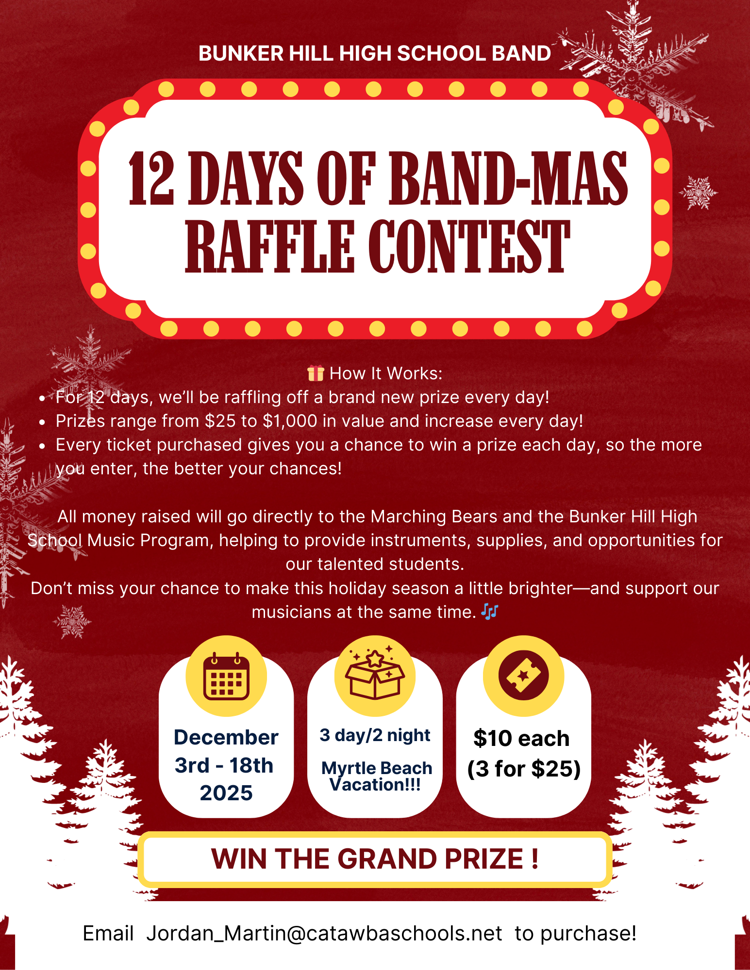 CORRECTION POST: 🎄 Bunker Hill High School Band — 12 Days of Band-mas Raffle! 🎁